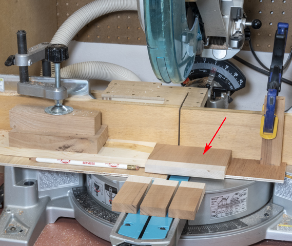 piece of oak has a thin slice just over 1/16” cut off using the bandsaw. The setup is shown in the two photos below.